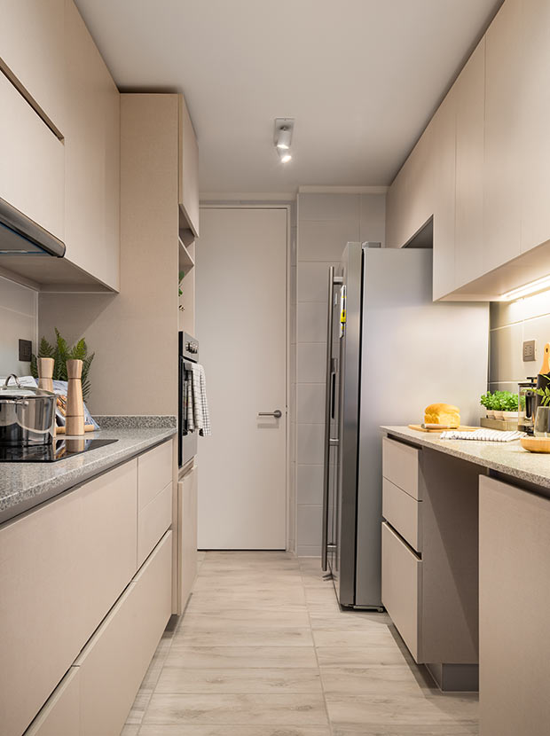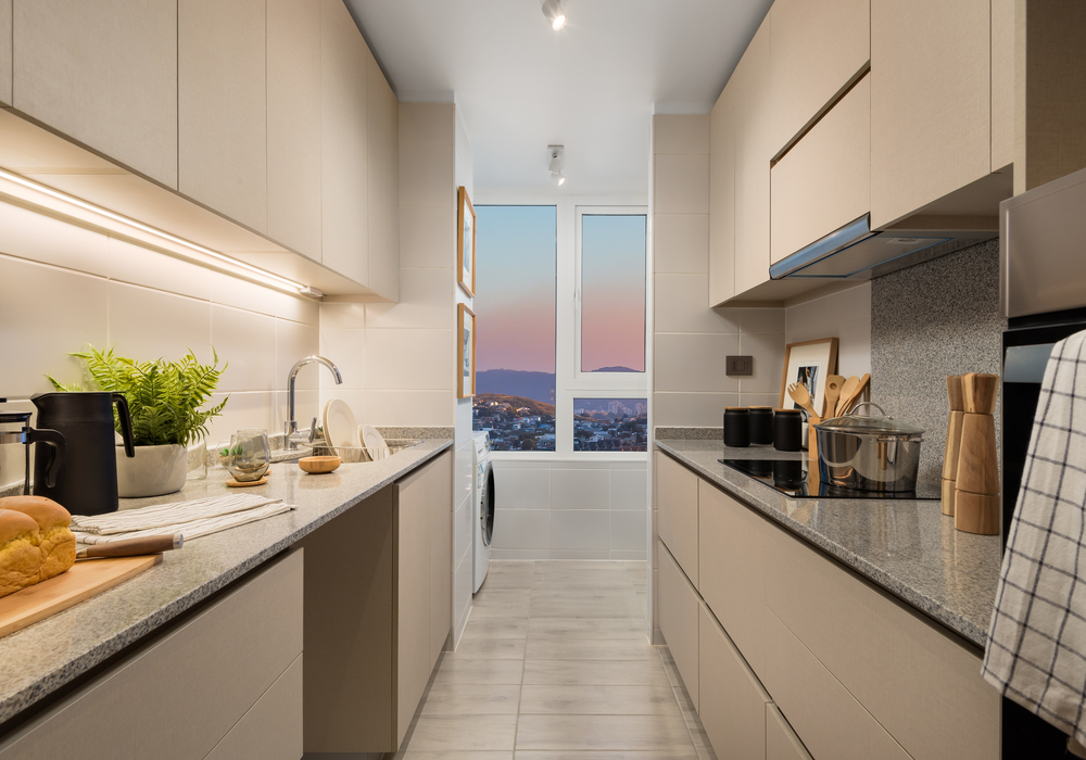 Cocina cerrada equipada con excelente almacenamiento, muebles superiores con iluminación LED y conexión a logia según modelo.