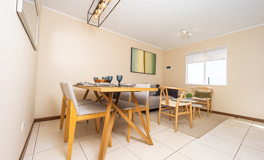Diseñamos tu casa para dar una mayor amplitud a cada ambiente, con terminaciones para que puedas disfrutar de los espacios que siempre has soñado: piso de cerámica en cocina, living comedor y baños, alfombras en dormitorios y clósets incluidos.