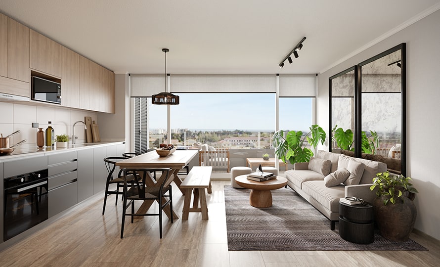 La funcionalidad y el estilo se unen en tu departamento. Disfruta con amigos en tu terraza con barandas vidriadas, prepara deliciosas comidas en tu cocina equipada y con cubierta de porcelanato.