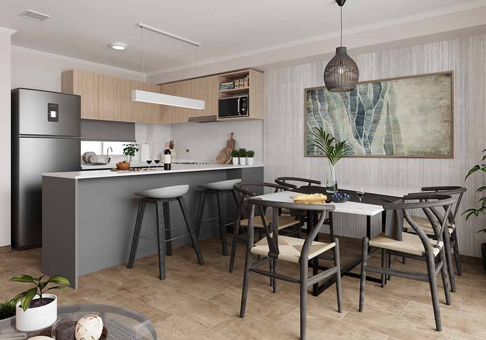 Cocina abierta con moderno y funcional diseño, equipada con fina cubierta de porcelanato, encimera, horno y campana, para compartir mientras preparas los más dulces momentos.