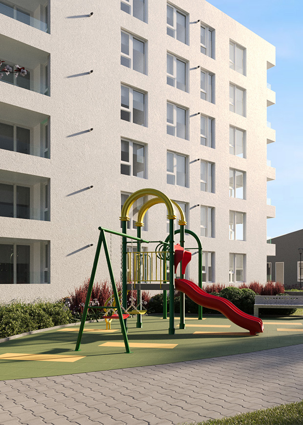 Disfruta de un completo equipamiento, piscina, dos salón gourmet, gimnasio, sala de yoga, áreas verdes con juegos infantiles, plaza central y bicicleteros con estación de reparación. Todo lo que necesitas para llenarte del relajo que buscas y compartir con quienes más quieres.