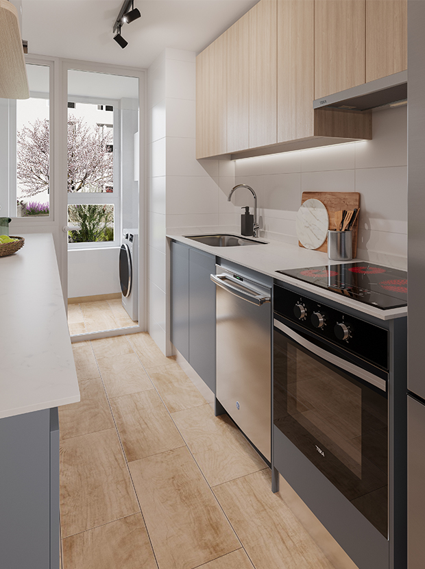 Cocina abierta o cerrada, según modelo, con moderno y funcional diseño, equipada con cubierta de porcelanato, full electric, muebles aéreos con iluminación led y logia cerrada.