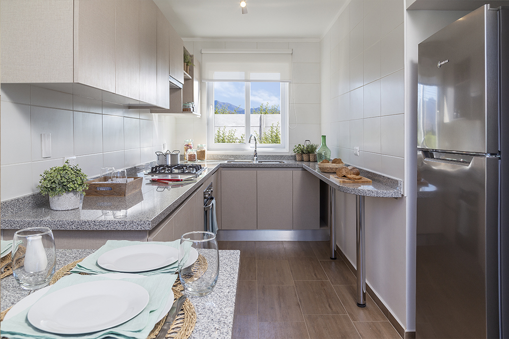 Tú y tu familia merecen lo mejor, por eso nuestras casas están diseñadas con las mejores terminaciones: piso gres porcelánico en el primer piso, flotante en el segundo y cubierta de granito en la cocina.