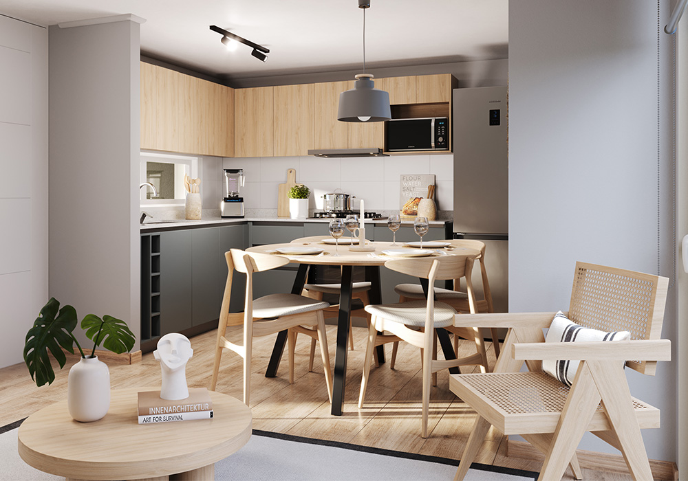 Descubre increíbles espacios y terminaciones en tu nuevo hogar. Cocina cerrada o integrada según modelo, equipada y con cubierta de porcelanato en el modelo Townhouse y granito en modelo Castaño y Andalhue, ¡para crear preparaciones únicas!