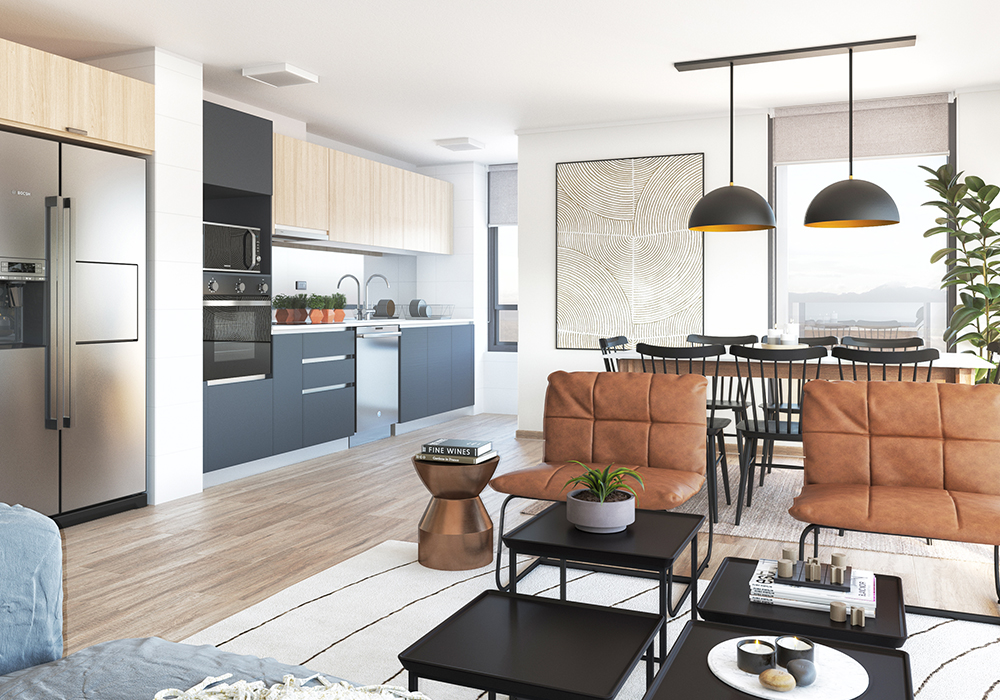 Amplios y cómodos espacios, que se adaptan a tus necesidades. Encuentra la calidad en sus ventanas de PVC y termopanel, piso gres porcelánico, cocina full equipada y fina cubierta de porcelanato, para que disfrutes al máximo, con las mejores terminaciones.