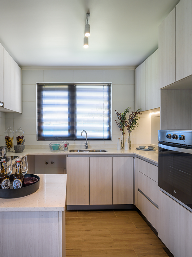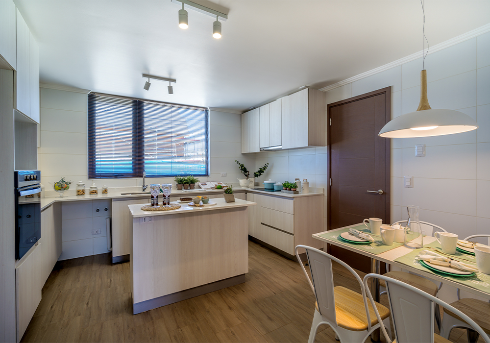 Una increíble cocina con cubierta de cuarzo, muebles superiores con iluminación LED, encimera vitroceramica y comedor de diario o isla, según modelo.