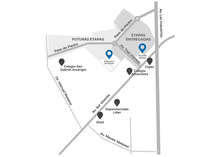 incluye decoración, accesorios ni equipamientos, consulte directamente en la sala de ventas sobre las características de la propiedad. El proyecto no incluye paisajismo (pasto, árboles, arbustos, etc) ni huella o pastelones peatonal o vehicular de acceso. Las superficies total y útil se definen conforme al Art. 1.1.2. OGUC, en relación a DDU 110 de fecha 14/08/2002, Art. 5.1.11. O.G.U.C y DDU 361 de fecha 16 de junio de 2017. Lo anterior, de conformidad con lo dispuesto en el artículo 18 inciso 7° de la L.G.U.C. *Las terminaciones y equipamiento de este departamento piloto corresponden al proyecto Tres Vientos Etapa IX, siendo meramente ilustrativos.